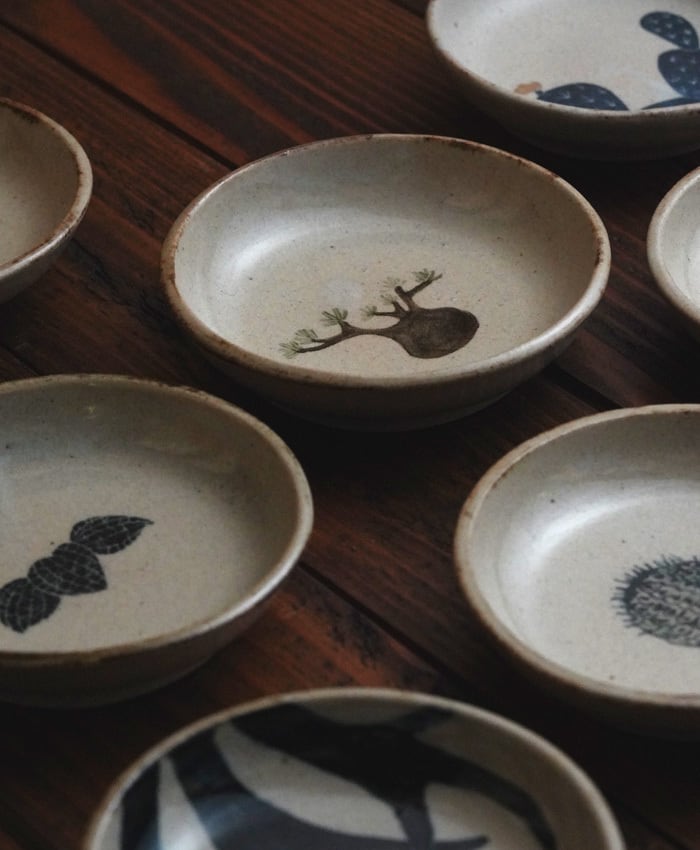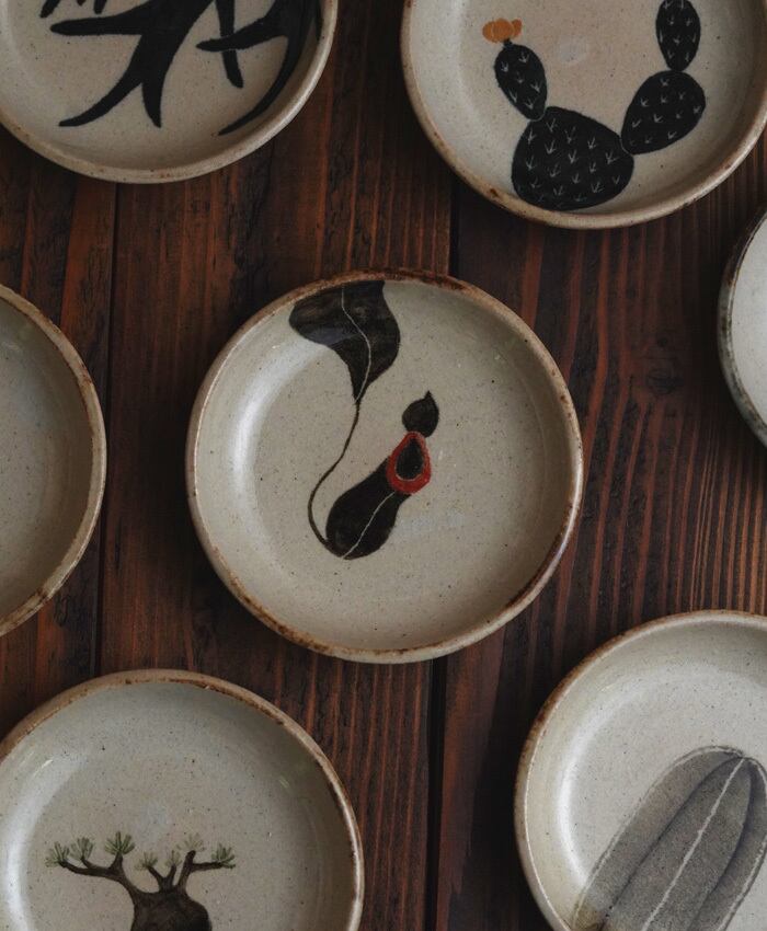 植物モチーフを一つ一つ筆で描き絵付けした豆皿です。和食器を感じさせるテイストになるよう土をブレンドし、植物柄とも相まって和洋折衷な豆皿を楽しんでもらえたらと思います。